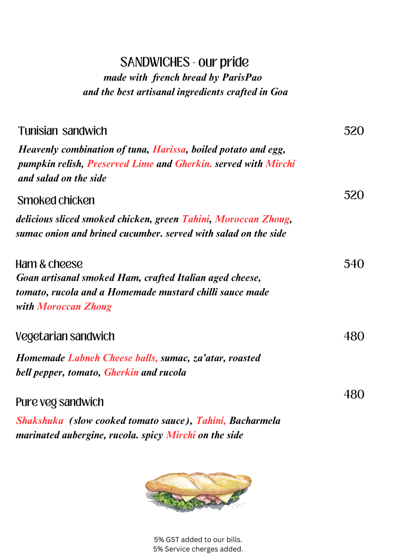 Shakshuka sauce (slow cooked tomatoes), tahini, marinated aubergine, rucola. spicy mirchi relish on the side. made with french bread